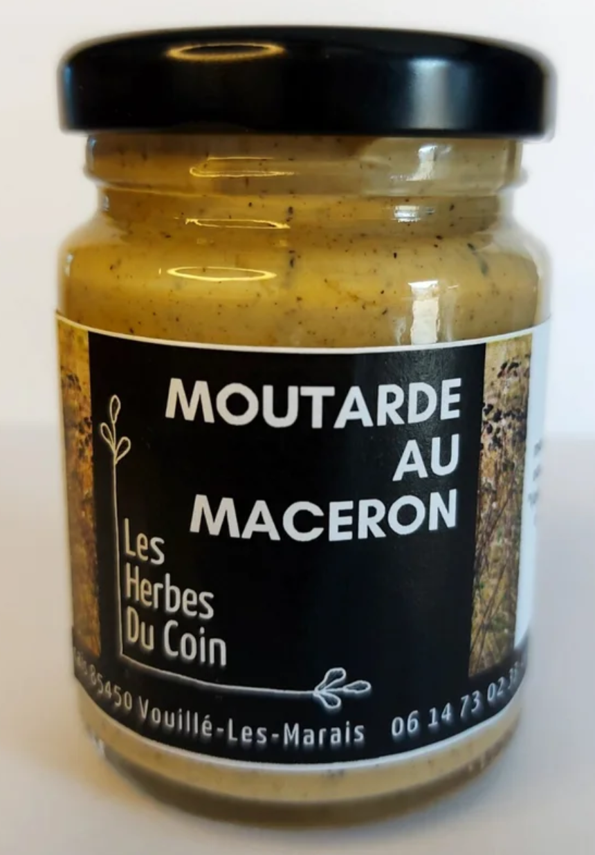 Composition : Moutarde de Dijon ( Graines de moutarde, vinaigre d’alcool, eau, sel ), Baies de Maceron issues de notre récolte (3%)