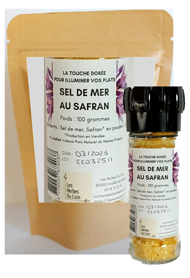 Découvrez notre sel de mer au safran, une alliance raffinée entre la pureté du sel marin et la richesse aromatique du safran cultivé dans notre safranière à Vouillé-les-Marais. Ce mélange subtil apporte une saveur délicatement iodée et épicée à vos plats, avec une belle couleur dorée qui éveille l’appétit.