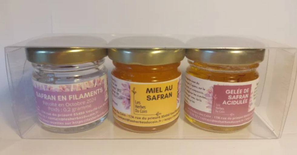 Description : Ce coffret réunit trois spécialités safranées élaborées dans mon atelier à Vouillé-les-Marais.